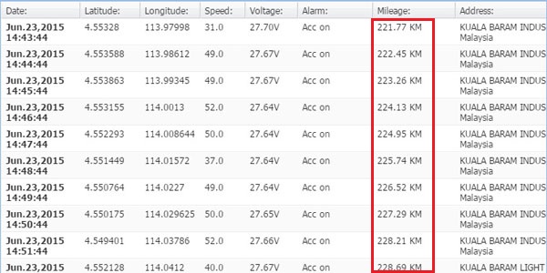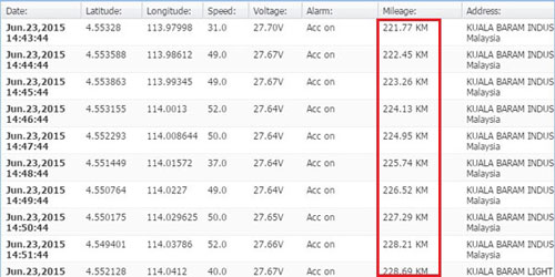 Displays total mileage driven of a vehicle for a pre-defined period of time, which can be viewed and printed as report.